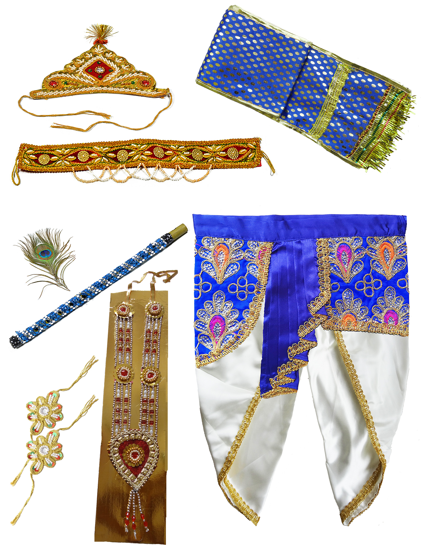 Janmashtami Is The Festival That Celebrates The Birth Of Krishna. On The Day Of This Festival, It Is An Age Old Custom To Dress Up Little Boys In Krishna Themed Ethnic Wear. Baby Krishna Is A Colorful Character With Some Very Typical Signs. Lord Krishna Is A God Who Loves To Dress Up And As He Was A Prince, He Ought To Have A Crown. So Give Your Little Prince A Beautiful Krishna Ethnic Wear – Dhoti Dupatta Set, Crown, Flute, Peacock Feather, Waist Belt, Necklace And Wrist Bands. Get Him Ready Into A Cute Little One Baby Krishna. The Blue Colour has been associated with Lord Krishna like no other. The Blue Fan accentuates the Ivory Dhoti in a way which will make the child stand out and completely complements the Peacock feather on your Little Krishna’s crown.